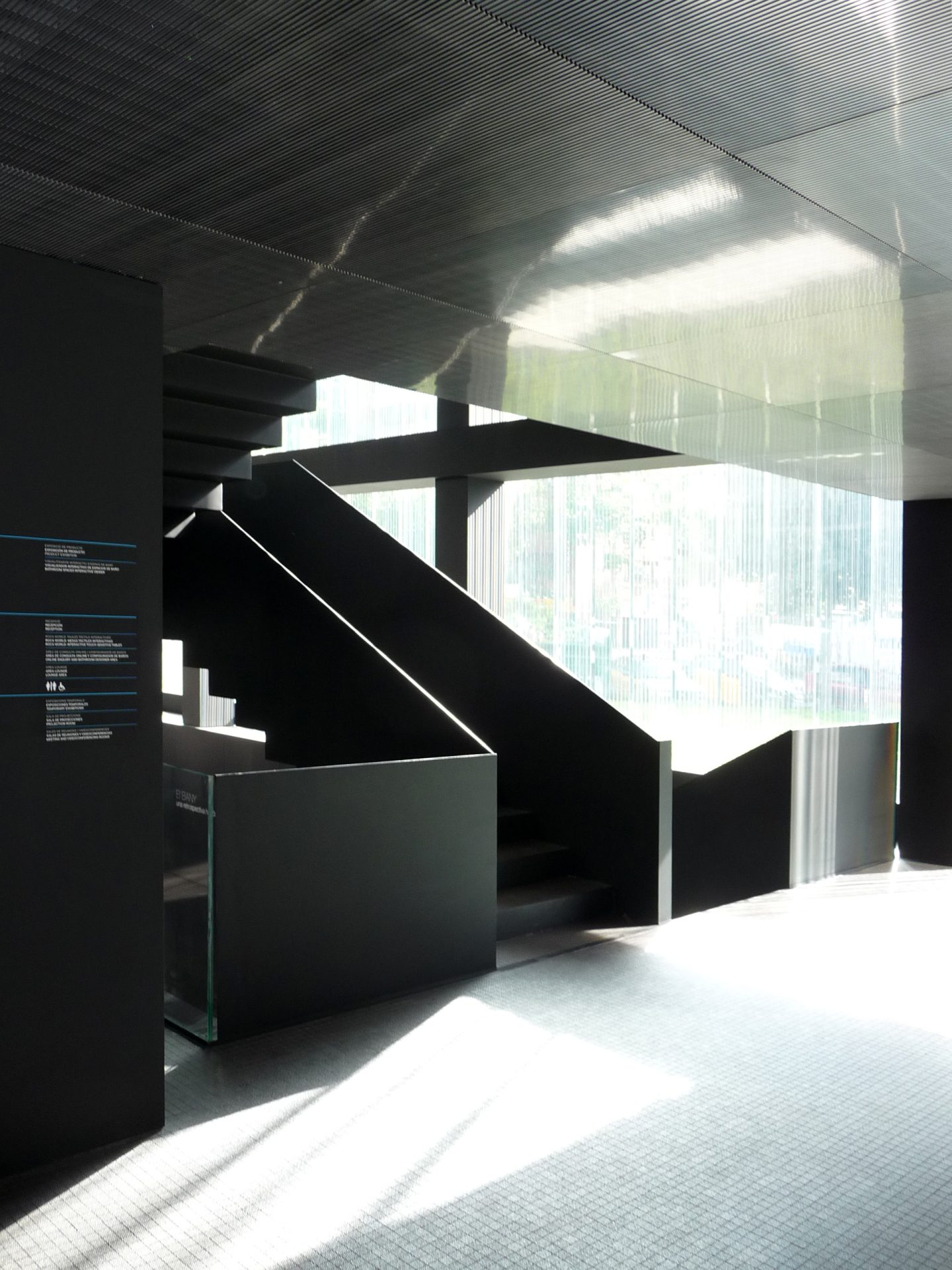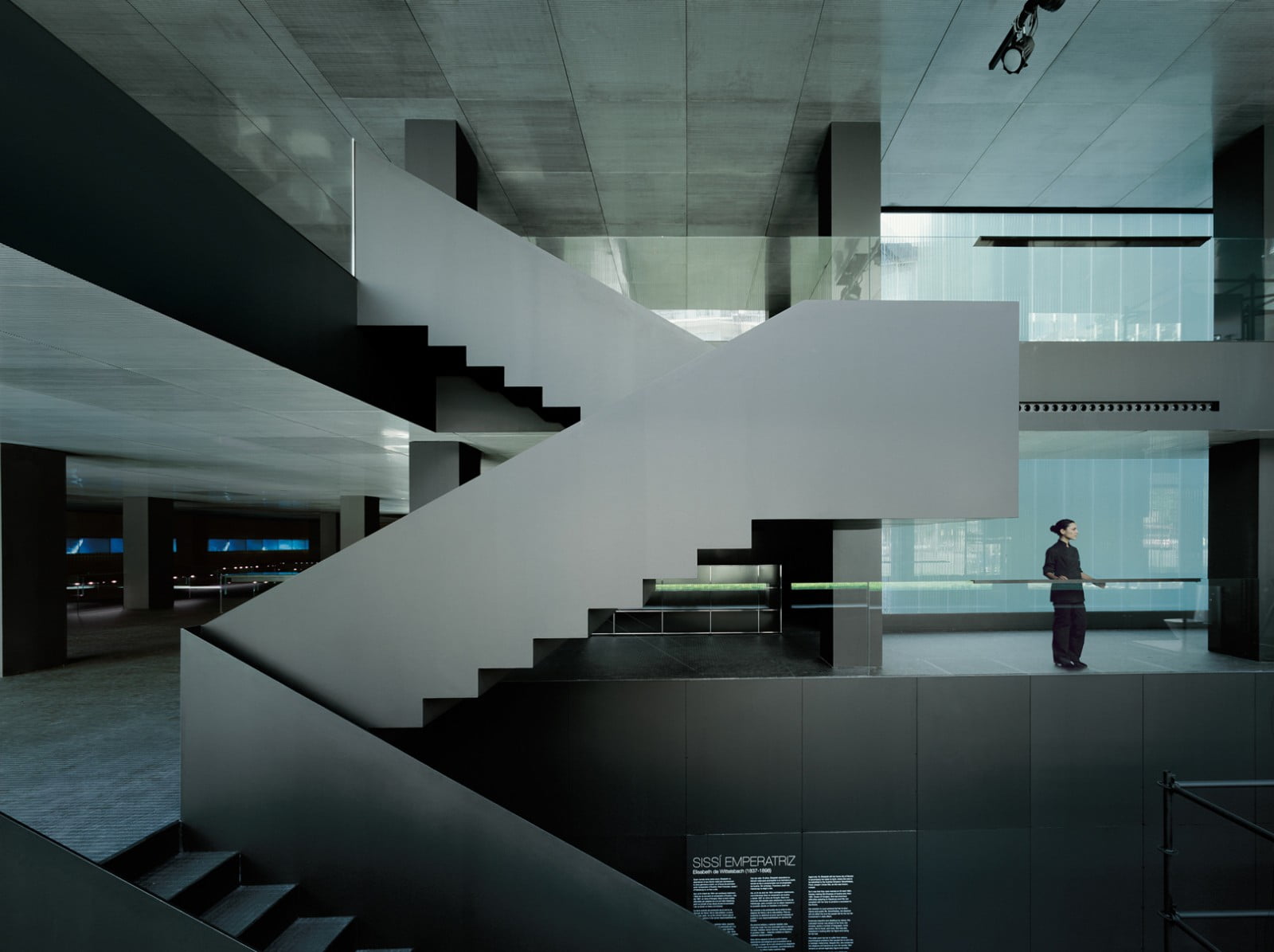 Escala interior d’acer, baranes de vidre, tancaments interiors, aplacats, i mobiliari per exposició